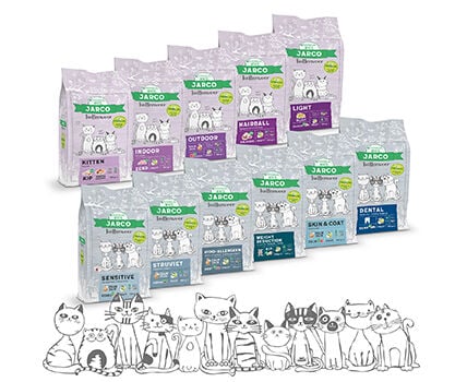 In het kattenvoer heeft Jarco ook verschillende keuzes. Zo heeft het merk kattenbrokjes voor opgroeiende kittens, indoor kattenvoer voor binnenkatten en outdoor kattenvoer voor actieve buitenkatten. Heeft je kat een slecht verteringsstelsel of voedselovergevoeligheid, dan kun je hypoallergeen kattenvoer geven. En heeft je kat last van struvietgruis en stenen, dan is er Jarco Struviet.